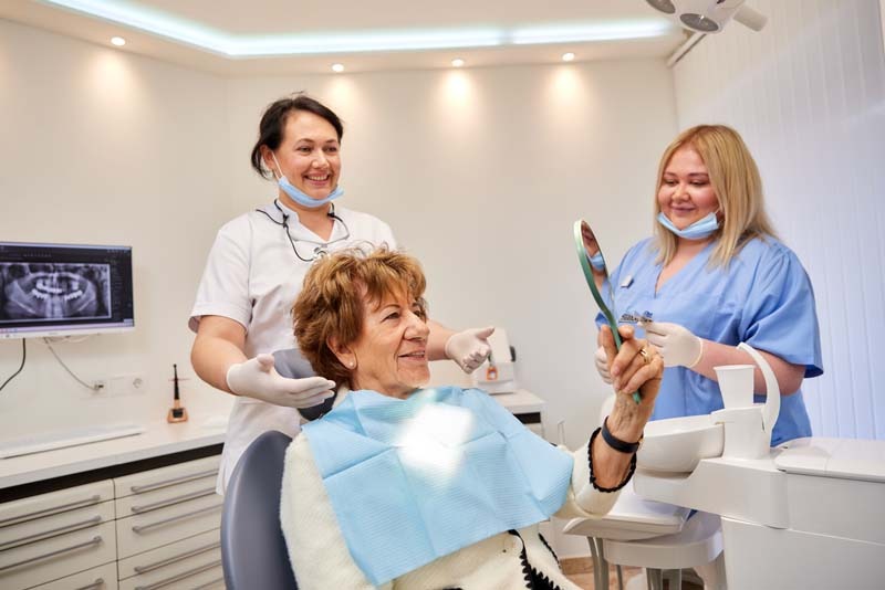 Zahnärztin und Assistentin in weißer und blauer Arbeitskleidung betreuen Patientin im Zahnarztstuhl, Patientin hält Handspiegel und trägt blauen Schutzlappen.