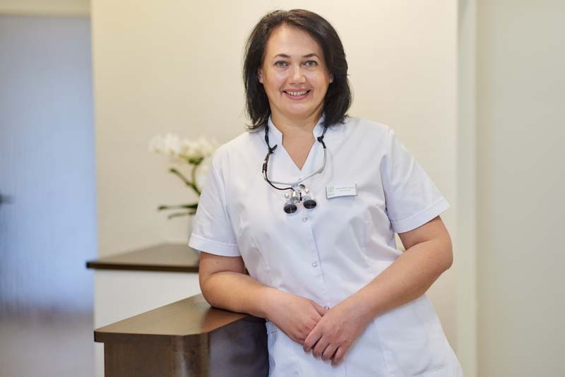 Frau in weißer medizinischer Arbeitskleidung mit Lupenbrille um den Hals lehnt an einer dunklen Theke, im Hintergrund weiße Blüten auf einem Tisch.